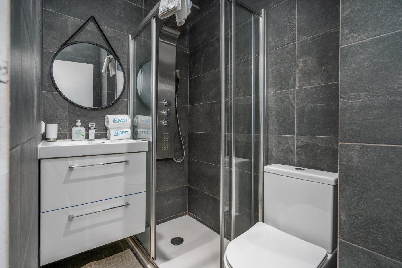 Este apartamento com ar condicionado tem 1 quarto, uma sala de estar, uma kitchenette totalmente equipada com forno e máquina de café, e 1 casa de banho com chuveiro e um secador de cabelo. Toalhas e roupa de cama são providenciadas neste apartamento.