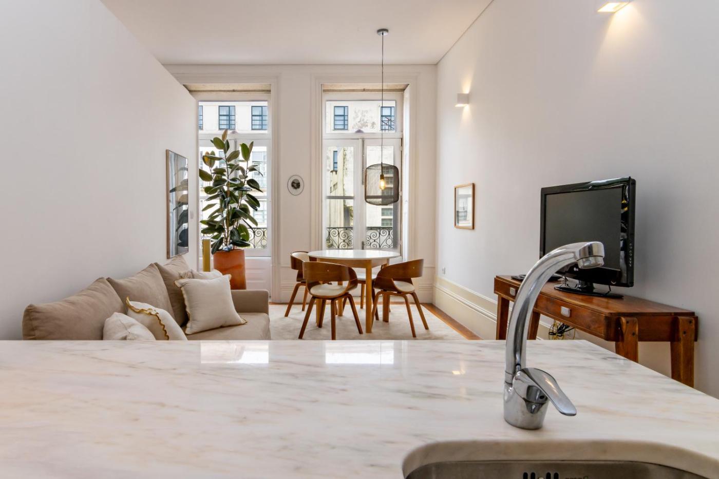 Apartamento Estúdio. The apartment has 1 bedroom and 1 bathroom with a shower and free toiletries. Guests can make meals in the kitchen that features a stovetop, a refrigerator, a dishwasher and kitchenware. The apartment features parquet floors, a seating area with a flat-screen TV, a tea and coffee maker, a dining area as well as a quiet street view. The unit has 1 bed.